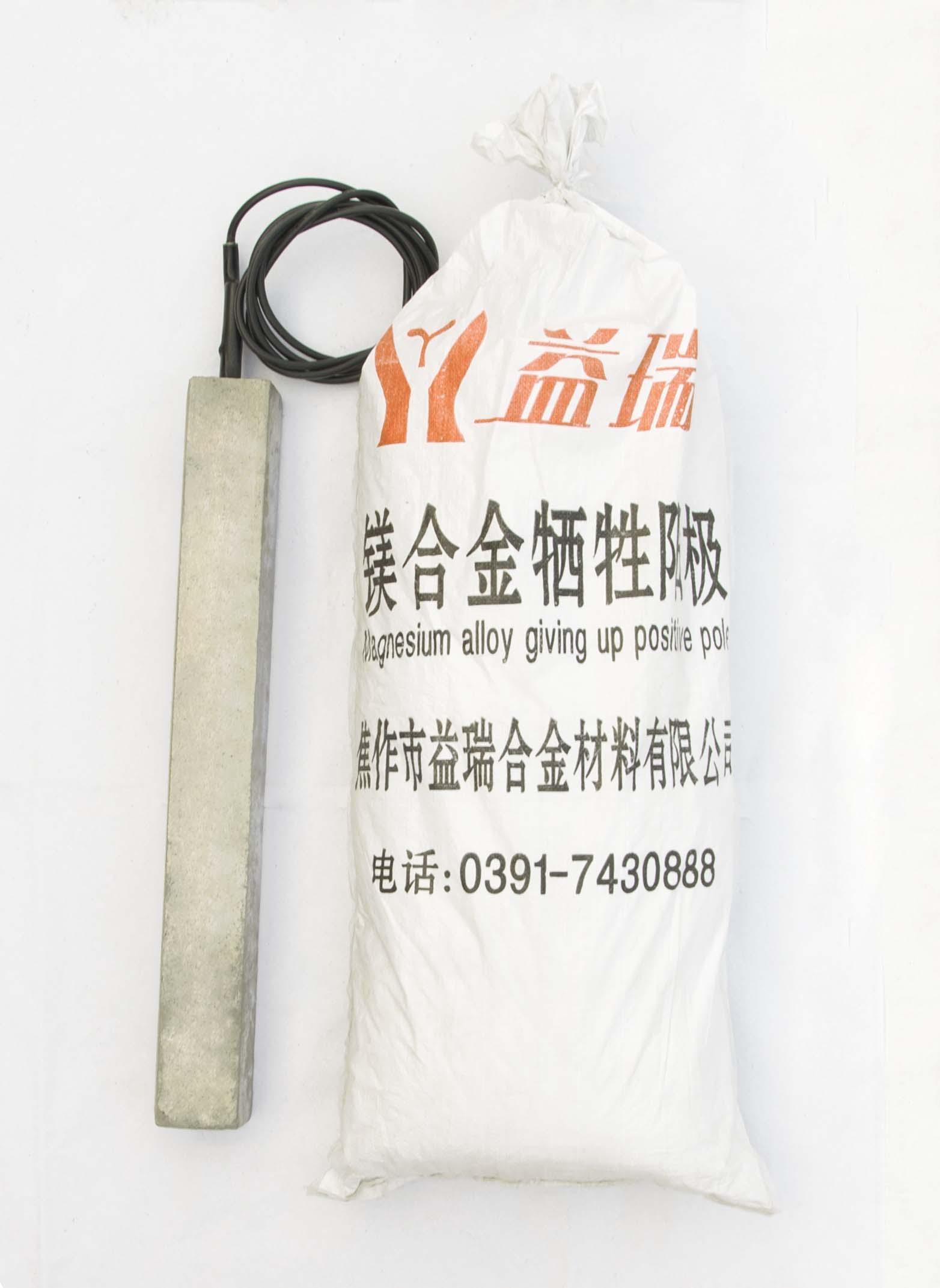 以上的鎂合金犧牲陽極也可以經組裝后提供給客戶。裸陽極首先和電纜連接,連接部位用環(huán)氧樹脂密封。然后加填充料封裝在棉布袋里。