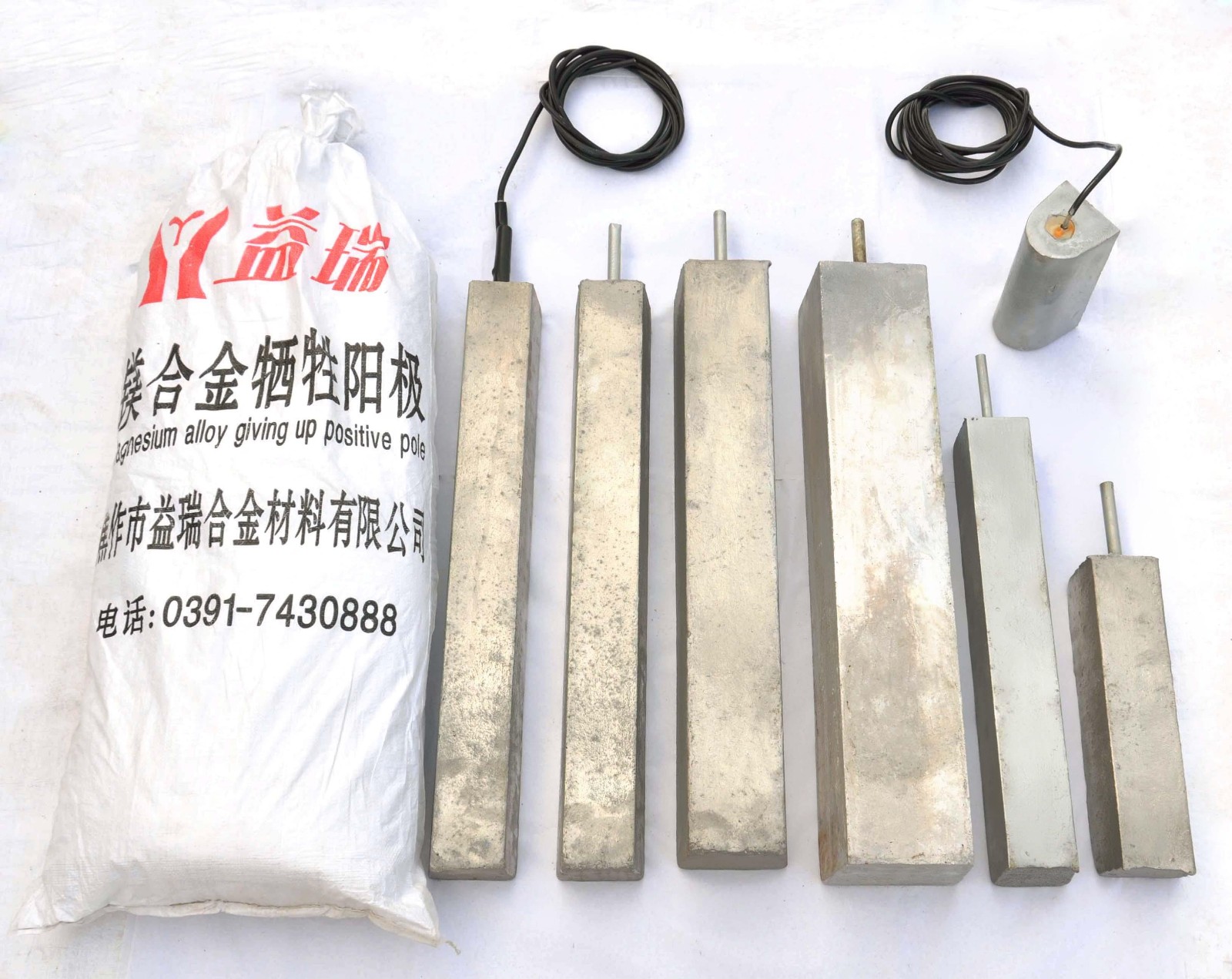 任一型號犧牲陽極一支。 電纜導線一根:按顧客設計要求長度及規(guī)格焊接在犧牲陽極上,并用環(huán)氧樹脂,氯乙烯熱縮套密封。 專用填料一包;陽極布袋一只。